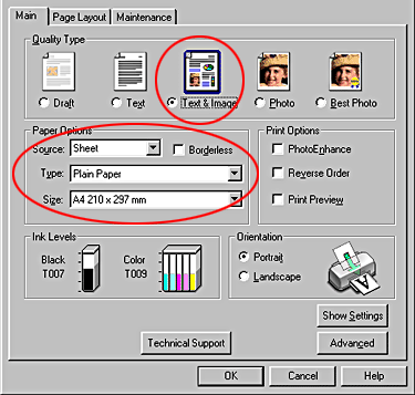 Click the Main tab, and then select Sheet, Plain Paper and A4 as the Paper Options settings and Text & Image as the Quality Type setting.