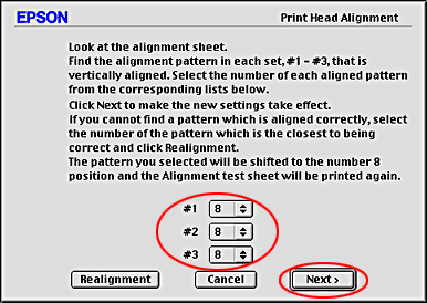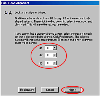If you cannot find a line that is aligned correctly, select the number of the line closest to being correct and click Realignment. The lines you selected will be reset to the center (number 8) position and the alignment test sheet will be printed again.