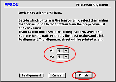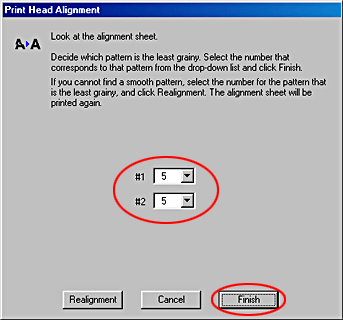 Look for a pattern that does not contain any dark or light banding. Next, select the corresponding pattern number from the appropriate list in the Print Head Alignment dialog box. Then click Finish. The new settings are put into effect.
