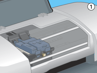 Make sure that the ink cartridge tabs are not under the hinges protruding from the base of the opened ink cartridge clamp, as this could damage the clamp.
