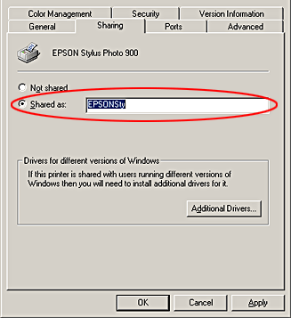If you want Windows XP and 2000 to automatically download printer drivers to computers that are running different versions of Windows, click Additional Drivers and select the environment and the operating systems for the other computers. Click OK, and then insert the printer software CD in the CD-ROM drive. Select WIN9X for Windows Me, 98, or 95. Click OK to install the additional drivers.