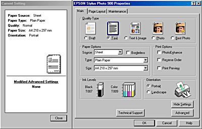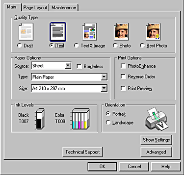 You can make Quality Type, Paper Options, Print Options, Orientation and Advanced settings and check the ink levels. Refer to the appropriate section below.
