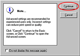 | Click Advanced on the Main menu. If the following Note dialog box appears, click Continue. The Advanced menu appears. |