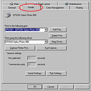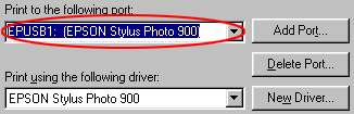 If EPUSBX: (EPSON Stylus Photo 900) is displayed in the Print to the following port list, then the USB printer device driver and printer software are installed correctly. If the correct port is not displayed, proceed to the next step.