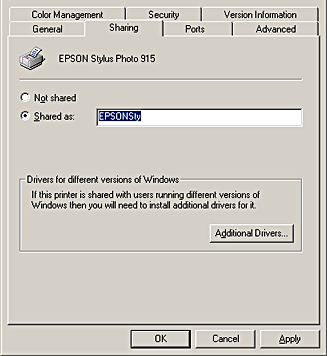 If you want Windows 2000 or XP to automatically download printer drivers to computers that are running different versions of Windows, click Additional Drivers and select the environment and the operating systems for the other computers. Click OK, and then insert the printer software CD in the CD-ROM drive. Select WIN9X for Windows Me, 98 or 95. Click OK to install the additional drivers.