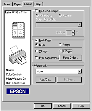 Select N-up as the Multi-Page setting on the Layout menu to print two or four pages of your document on one sheet of paper.