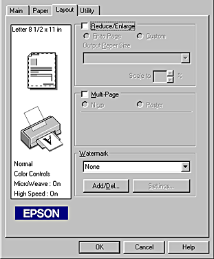 You can make Reduce/Enlarge, Multi-Page, and Watermark settings on the Layout menu. Refer to the appropriate section below.