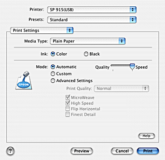 Depending on the media selected in the Media Type list (while Automatic is selected), a slider appears to the right of the Mode options that lets you choose Quality or Speed. Select Quality when print quality is more important than speed.