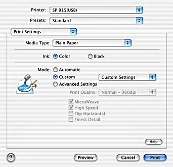 Selecting Custom as the Mode option enables the Custom Settings list, from which you can choose a ready-made setting designed for printing text and graphs. Or, you can select ColorSync, a color-matching method. You can also create and save your own custom settings. For details on making your own custom settings see Using the Advanced Settings mode.