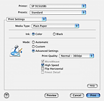 You can make Media Type, Mode, Ink, Copies, and Pages settings in the Print dialog box. From this dialog box, you can preview the document before printing. Refer to the appropriate section below.
