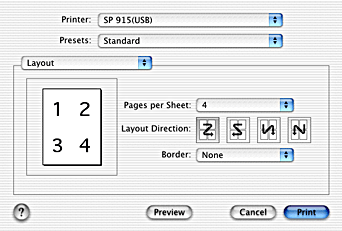 Prints multiple pages of your document on a single piece of paper. You can select from 1, 2, 4, 6, 9, or 16.