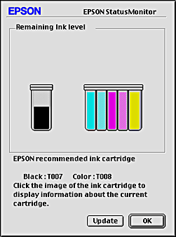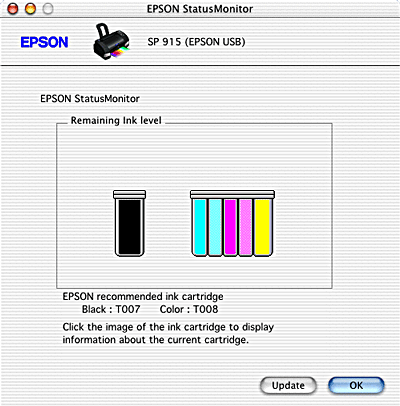 You can also use this utility to check ink levels before printing. When open, EPSON StatusMonitor displays the amount of ink remaining at the time it was opened. To update the ink level information, click the Update button.