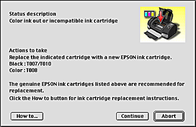 When the ink runs low or out, a How to button will appear. Click How to and EPSON StatusMonitor will lead you step-by-step through the ink cartridge replacement procedure.