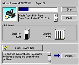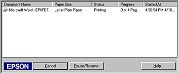It is possible to cancel printing using either the Progress Meter or EPSON Spool Manager. Refer to the appropriate section below.