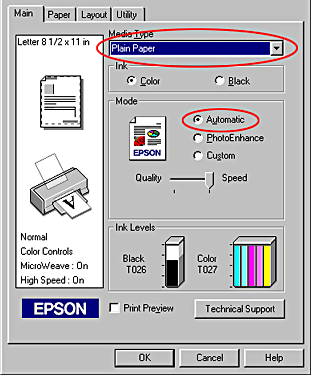 Click the Main tab, select Plain Paper as the Media Type setting, and Automatic as the Mode setting.