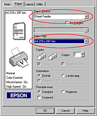 Click the Paper tab, select A4 as the Paper Size setting, and Sheet Feeder as the Paper Source setting.