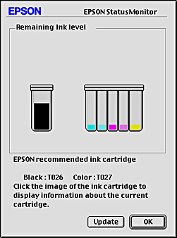 You can also use this utility to check ink levels before printing. When open, EPSON StatusMonitor displays the amount of ink remaining at the time it was opened. To update the ink level information, click the Update button.