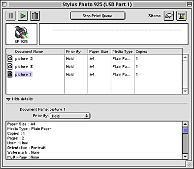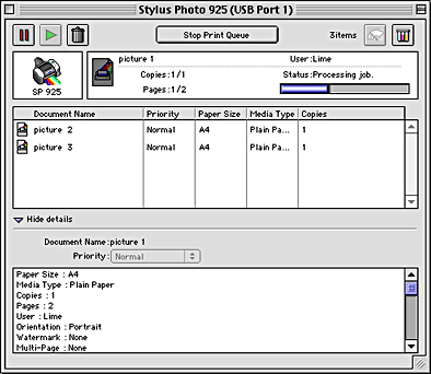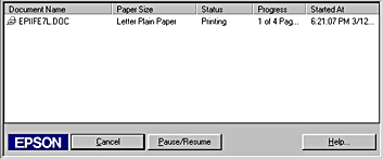 EPSON Spool Manager is similar to Windows Print Manager. If it receives two or more print jobs at one time, it holds them in the order that they were received (with printers on a network this may be called a print queue). When a print job reaches the top of the queue, the EPSON Spool Manager sends the job to the printer. From the Spool Manager, you can view print status information about the print jobs which have been sent to your printer. You can also cancel, pause and resume, or restart selected print jobs.