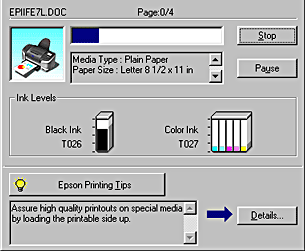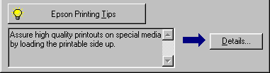 Tips for getting the most out of your EPSON printer software appear in the text box at the bottom of the Progress Meter window. A new tip appears every 30 seconds. For more details on a tip which is currently displayed, click the Details button.