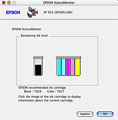 The graphic displays the amount of ink that was remaining when EPSON StatusMonitor was first opened. To update the ink-level information, click the Update button.
