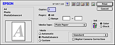 You can make Media Type, Mode, Ink, Copies, and Pages settings in the Print dialog box. From this dialog box, you can also access other dialog boxes, from which you can set the print time, preview the document before printing, and save spool data as a file. Refer to the appropriate section below.