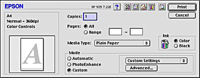 Selecting Custom as the Mode option enables the Custom Settings list, from which you can choose a ready-made setting designed for printing text and graphs. Or, you can select ColorSync, a color-matching method. You can also create and save your own custom settings. For details on making your own custom settings see Making the Advanced settings.