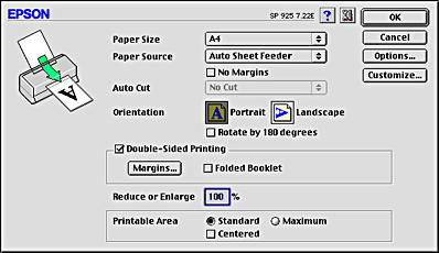 In the Page Setup dialog box, you can change the paper size, specify the paper orientation, print on both sides of the paper, rotate your document by 180 degrees, reduce or enlarge your printout, and adjust the printable area.