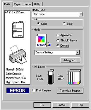When you select a custom setting, other settings such as Print Quality and Color Adjustment are made automatically. Changes to these settings are reflected in the display at the left side of the Main menu.