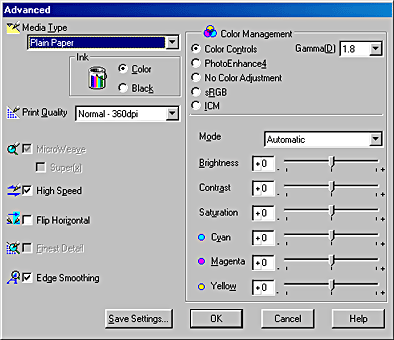 The settings in the Advanced dialog box give you complete control over your printing environment. Use these settings to experiment with new printing ideas or to fine-tune a range of print settings to meet your individual needs. Once you are satisfied with your new settings, you can give them a name and add them to the Custom Settings list on the Main menu.