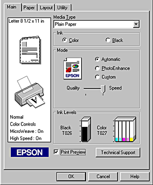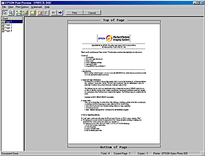 When you send a print job to the printer, the EPSON Print Preview window opens, allowing you to make changes before printing.