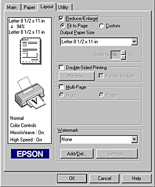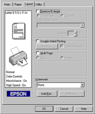 You can make Reduce/Enlarge, Double-Sided Printing, Multi-Page, and Watermark settings on the Layout menu. Refer to the appropriate section below.