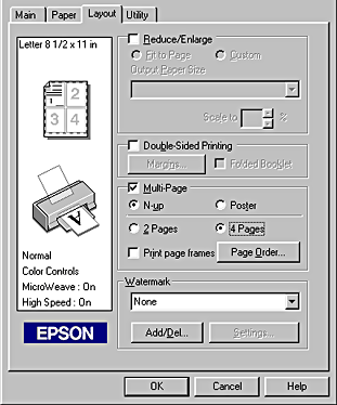 Select N-up as the Multi-Page setting on the Layout menu to print two or four pages of your document on one sheet of paper.