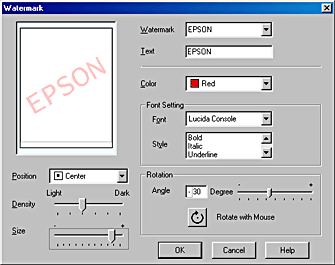 Make sure that the appropriate watermark is selected in the Watermark list box, then make Color, Position, Density, Size, Font, Font Style, and Angle settings. For details, please see online help. Your settings will be reflected in the display at the left side of the dialog box.