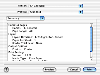 In the Print dialog box with the Summary option selected, you can confirm the current settings in the Print dialog box.