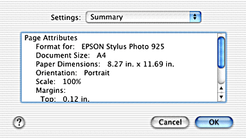 Select Page Attributes or Summary. When Page Attributes is selected, the page setting items will be displayed. When Summary is selected, a list of the current settings will be displayed. For more information on Summary, see Showing the current settings in the Print dialog box. |