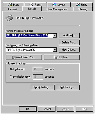 For Windows Me and 98 users, click the Details tab and make sure that EPUSBx: (EPSON Stylus Photo 925) is displayed in the Print to the following port list box. For Windows XP and 2000 users, click the Ports tab and make sure that USBxxx, EPSON Stylus Photo 925 is displayed in the Print to the following port(s) list box.