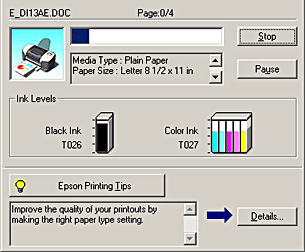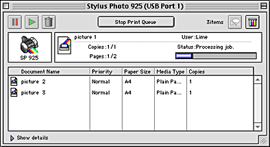 EPSON Spool Manager is similar to Windows Print Manager. If it receives two or more print jobs at one time, it holds them in the order that they were received (with printers on a network this may be called a print queue). When a print job reaches the top of the queue, the EPSON Spool Manager sends the job to the printer. You can cancel print jobs from the Spool Manager. You can also view print status information about the print jobs which have been sent to your printer, as well as pause and resume or restart selected print jobs.