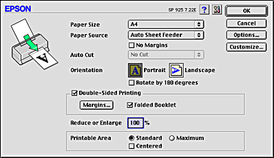 The EPSON Stylus Photo 925 supports double-sided printing. There are two types of double-sided printing available. Standard double-sided printing allows you to print the odd-numbered pages first. Once these pages are printed, they can be reloaded to print the even-numbered pages onto the opposite side of the paper. Folded Booklet double-sided printing allows you to make single-fold booklets. Refer to the appropriate section below.