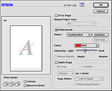 For Macintosh, select the Watermark check box in the Layout dialog box, and then select the desired watermark from the Name list.