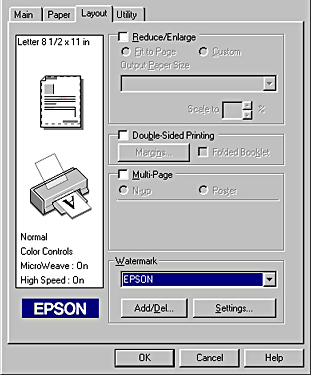 | For Windows, select the desired watermark from the Watermark list on the Layout menu, and then click the Settings button. |