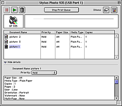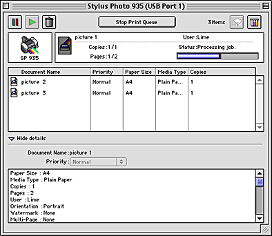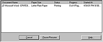 EPSON Spool Manager is similar to Windows Print Manager. If it receives two or more print jobs at one time, it holds them in the order that they were received (with printers on a network this may be called a print queue). When a print job reaches the top of the queue, the EPSON Spool Manager sends the job to the printer. From the Spool Manager, you can view print status information about the print jobs which have been sent to your printer. You can also cancel, pause and resume, or restart selected print jobs.