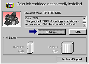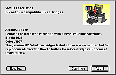 When the ink runs low or out, a How to button will appear below the text box. Click How To and EPSON Status Monitor 3 will lead you step-by-step through the cartridge replacement procedure.