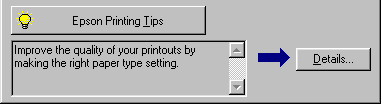 Tips for getting the most out of your EPSON printer software appear in the text box at the bottom of the Progress Meter window. A new tip appears every 30 seconds. For more details on a tip which is currently displayed, click the Details button.