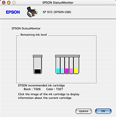 You can also use this utility to check ink levels before printing. When open, EPSON StatusMonitor displays the amount of ink remaining at the time it was opened. To update the ink level information, click the Update button.