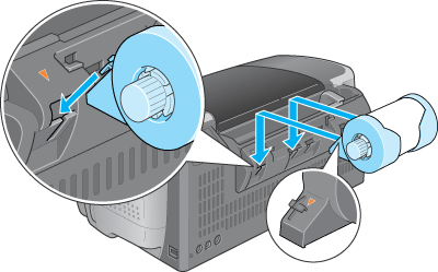 Insert the roll paper holder into the slots at the rear of the printer by lining up the inverted triangle marks on the paper holder with the corresponding marks on the back of the printer.