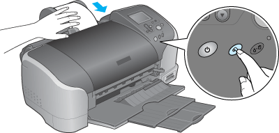 Remove the paper support, lower the output tray, slide out the extension (for other than 210 mm roll paper) or attach the catcher (for 210 mm roll paper), and then turn on the printer.
