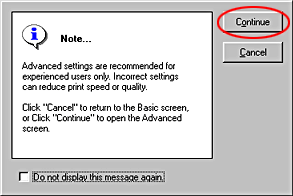 To open the Advanced menu, click Advanced on the Main menu. If the following Note dialog box appears, click Continue.