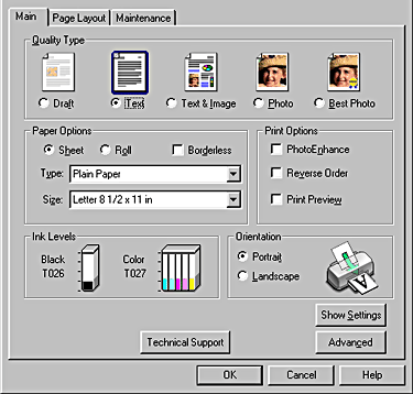 You can make Quality Type, Paper Options, Print Options, Orientation and Advanced settings and check the ink levels. Refer to the appropriate section below.