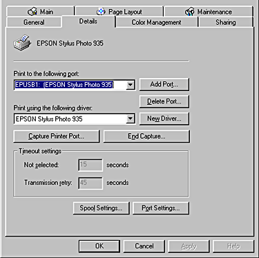 For Windows Me and 98 users, click the Details tab and make sure that EPUSBx: (EPSON Stylus Photo 935) is displayed in the Print to the following port list box. For Windows XP and 2000 users, click the Ports tab and make sure that USBxxx, EPSON Stylus Photo 935 is displayed in the Print to the following port(s) list box.