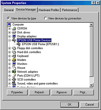 If USB Printer appears under Other devices, the USB printer device driver is not installed correctly. If EPSON Stylus Photo 935 appears, the printer software is not installed correctly.